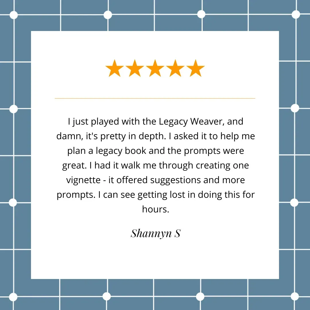 That’s why I built Tell It Like It Was: A Legacy Weaver. She’ll help you skip the blank page panic and those nagging “is my story worth telling?” questions — so you can finally share the stories only you can tell, in the way only you can tell them.